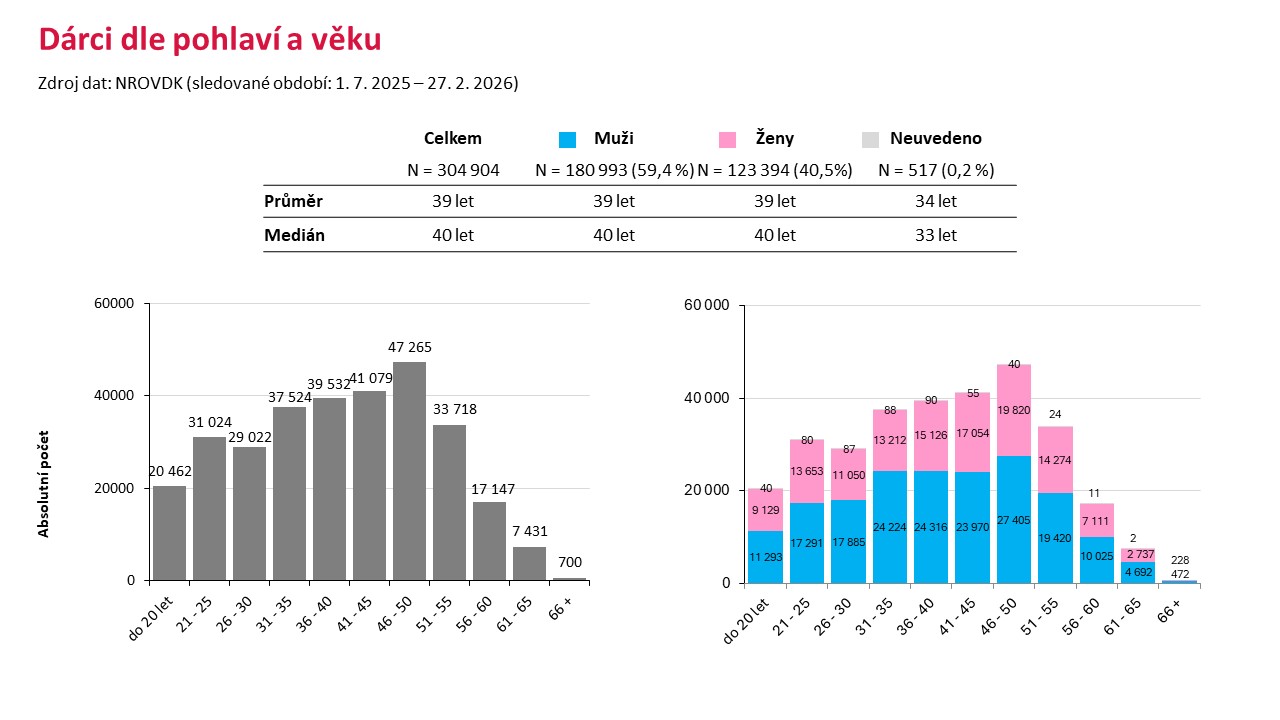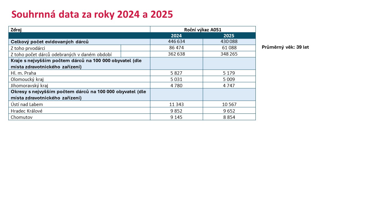 Podle aktuálních dat Ústavu zdravotnických informací a statistiky ČR (ÚZIS) bylo v roce 2025 v České republice evidováno více než 430 tisíc dárců krve, což představuje mírný pokles oproti roku 2024, kdy jich bylo téměř 447 tisíc. Odběr v loňském roce absolvovalo přes 348 tisíc dárců, zatímco o rok dříve to bylo více než 362 tisíc. Významnou roli přitom hrají i noví dárci – jejich počet však meziročně klesl z více než 86 tisíc v roce 2024 na přibližně 61 tisíc v roce 2025. Průměrný věk dárců činí 39 let a dlouhodobě převažují muži, kteří tvoří přibližně 59 % dárcovské základny. Regionálně patří k nejaktivnějším oblastem Praha, Moravskoslezský a Jihomoravský kraj. Data tak jasně ukazují, že i přes stále robustní dárcovskou základnu dochází k jejímu postupnému oslabování, a potvrzují nutnost systematicky oslovovat nové, zejména mladší prvodárce.